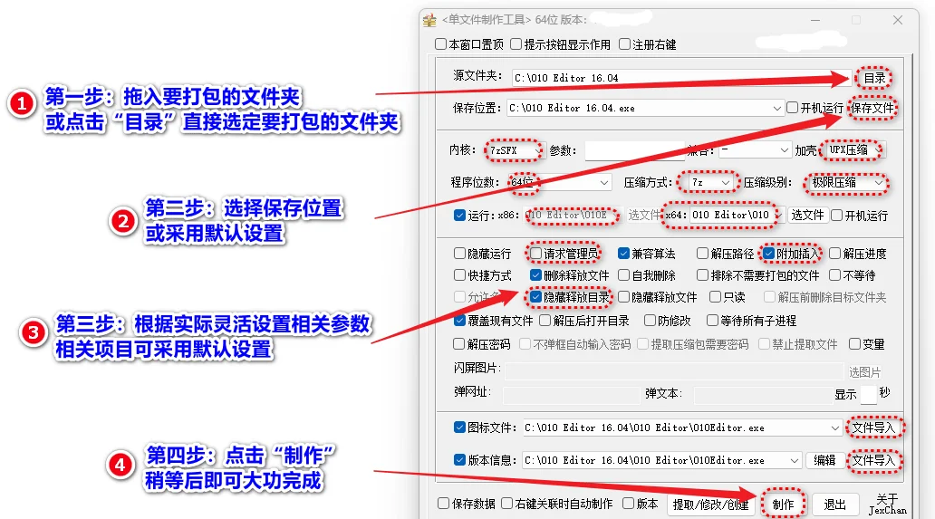本工具是一款小巧自定义功能强大的PECMD/7zSFX单文件制作工具,简化单文件制作程序步骤,默认四步即可制作出一个单文件,可制作出强大功能的单文件程序。