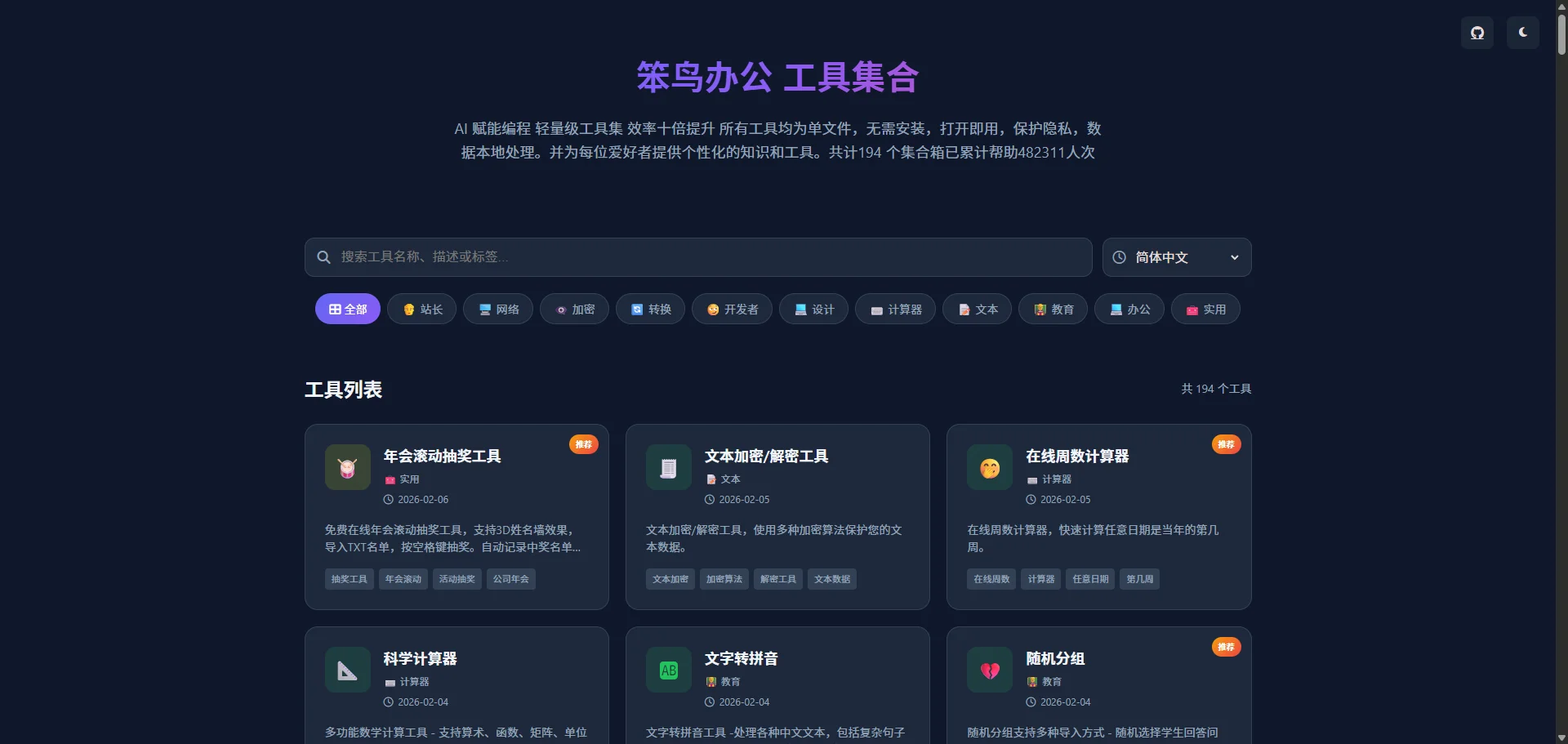 累计 194 个工具集合,已累计帮助 48231 + 人次,覆盖办公、开发、设计、生活、学习等全场景,无广告、无付费、无限制,永久免费开源。
